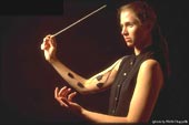 Teresa Marrin Nakra (pictured) is a former researcher at MIT who has developed a lycra vest with sensors that stretch towards the arm and track the electrical activity of the muscles, as well as detect the heartbeat. Everything connected to a PC through a cable protruding from the tail of the garment. The device has detected as famous conductors 'feel' the music in important moments, and now serves for classroom use, emphasizing pre-recorded songs as a result of movements expressed by the students.